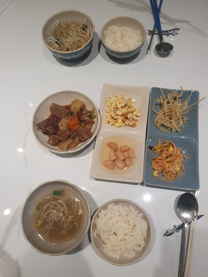 메뉴는 돼지갈비찜, 마늘장아찌, 스크램블에그, 간장진미채, 콩나물무침, 콩나물국 입니다.
