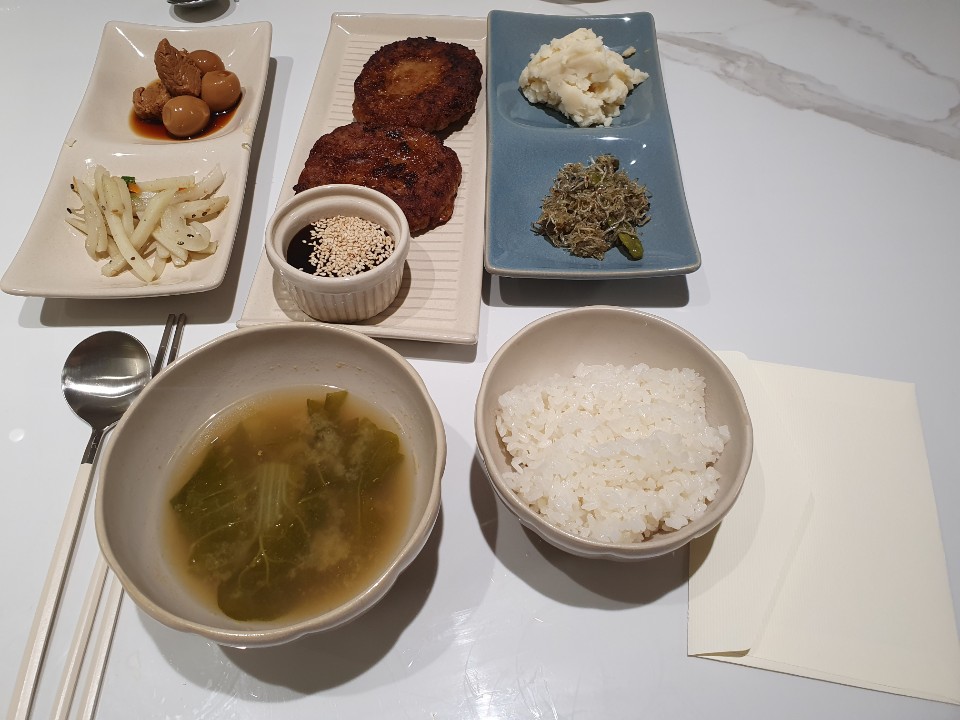 메인 반찬은 함박스테이크였습니다. 나눠서 먹으려고 총 4개 중 2개만 구웠는데 다른 반찬이 푸짐해서 배부르게 먹었어요. 근데 따로 함박스테이크에 소스가 없어서 집에있는 데리야끼 소스 꺼내서 먹었어요.